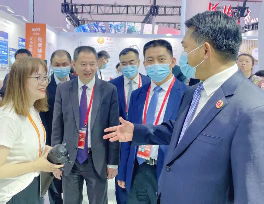 開幕式當(dāng)天下午,商務(wù)部副部長盛秋平在浙江省商務(wù)廳副廳長陳志成等領(lǐng)導(dǎo)的陪同下,蒞臨浙江館參觀。