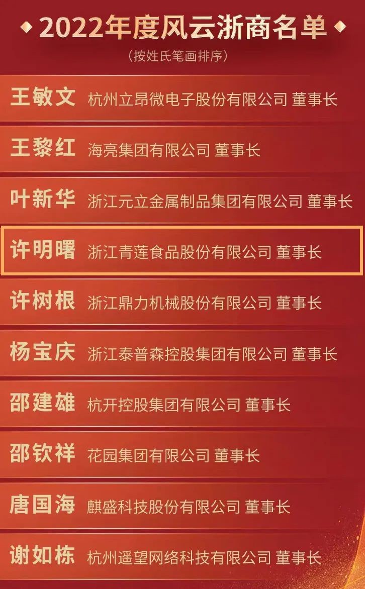 2月10日晚,2022年度“風云浙商”頒獎典禮在杭州舉行,十位年度風云浙商逐一揭曉。浙江青蓮食品股份有限公司董事長許明曙榮膺2022年度“風云浙商”!浙江省副省長胡偉為獲獎者許明曙頒獎。